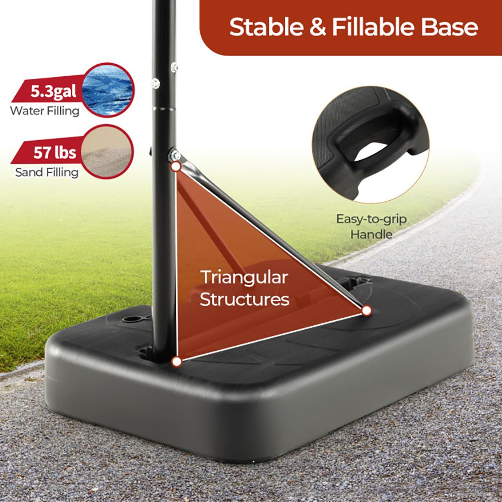 Large and Sturdy Base: The fillable base can be filled with 5.3-gallon water or 26 kg/58 lbs. sand for extra stability during intense play. Additionally, the basketball hoop is easy to move with handle on the base.