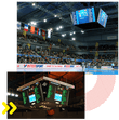 - Four giant LED screens mounted on a suspended steel structure provide optimal viewing angles for all spectators in the arena.