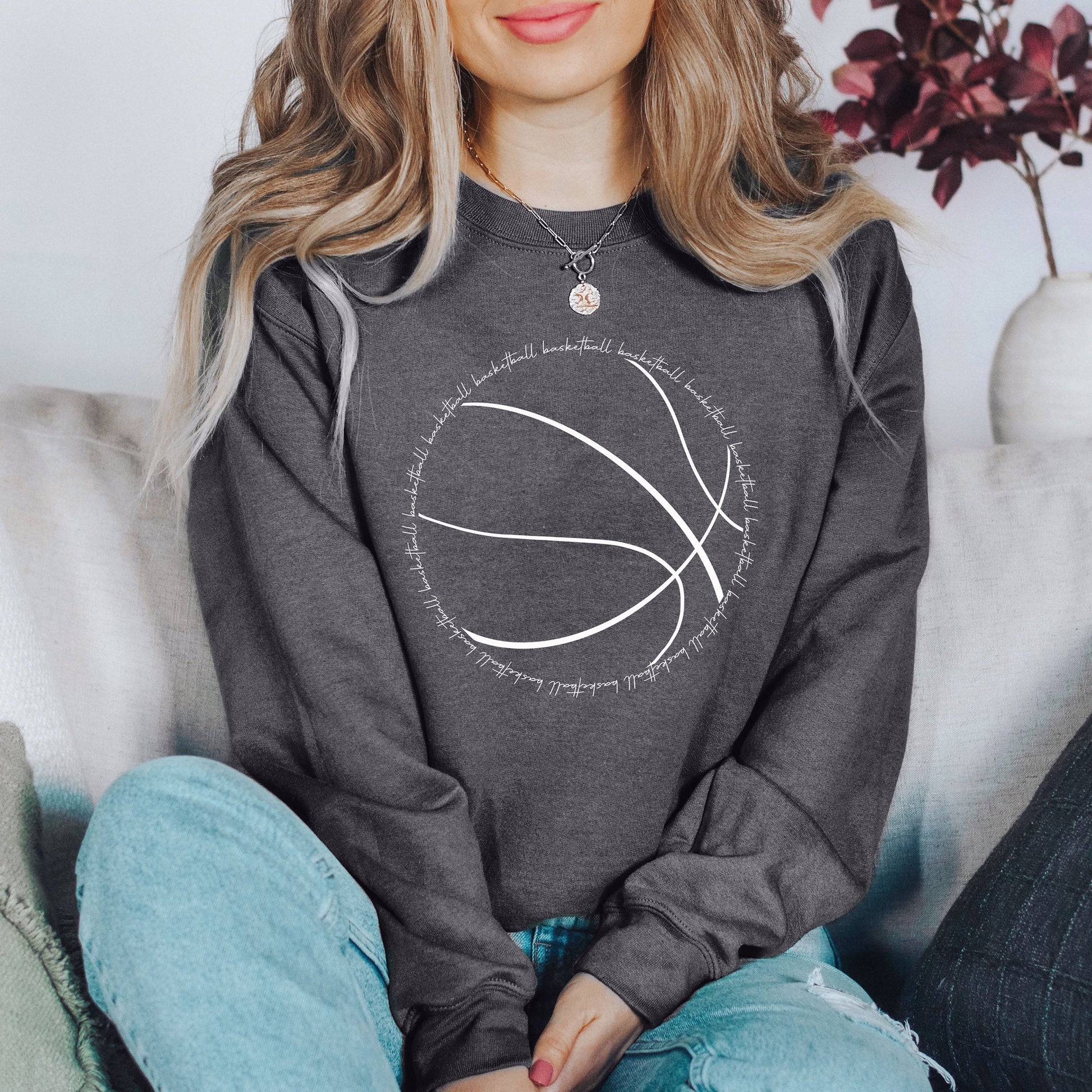 The Chic Basketball Word Art Sweatshirt pairs beautifully with jeans for a laid-back, trendy look. Layer it over your favorite shirt for added style, making it ideal for both casual outings and cozy nights in. Whether at a game or lounging at home, this sweatshirt is a must-have for anyone passionate about basketball.